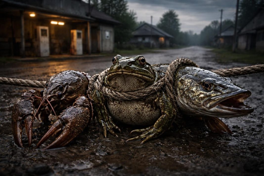 Autorul subliniază că prețurile la combustibili au crescut necontrolat, iar efectele se răsfrâng asupra tuturor produselor și serviciilor, afectând bugetele familiilor și activitatea companiilor. Fabula este folosită pentru a ilustra o dinamică în care cei trei actori politici – Racul, Broasca și știuca – trag în direcții diferite, fără să ajungă la o soluție comună, lăsând cetățenii să suporte consecințele.